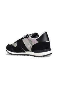 Valentino Rockrunner camouflage sneakers in black, green and pink. In fabric, suede and leather. Decorative rubber studs. Black leather counter. Rubber notched sole. Lace-up closure. Made in Italy.