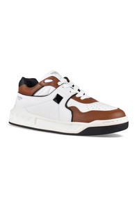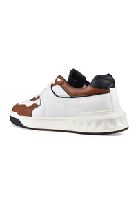Valentino Garavani One Stud sneakers in white leather. Black maxi stud on the exposed side. Black Valentino Garavani logo on heel and tongue. Black leather counter. Black outlines. Brown details. Leather insole. Logo rubber outsole with embossed studs. 100% calf leather. Made in Italy.