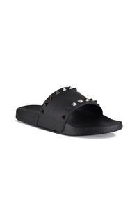 Valentino black leather flip-flops. Black leather strap with decorative studs. Flat rubber sole. Made in Italy.