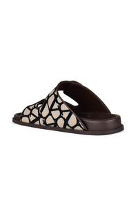 Valentino brown leather sandals. Beige iconograph canvas with black monogram logos. Brown V logo signature ornament. Front velcro closure. Rubber sole. Made in Italy.