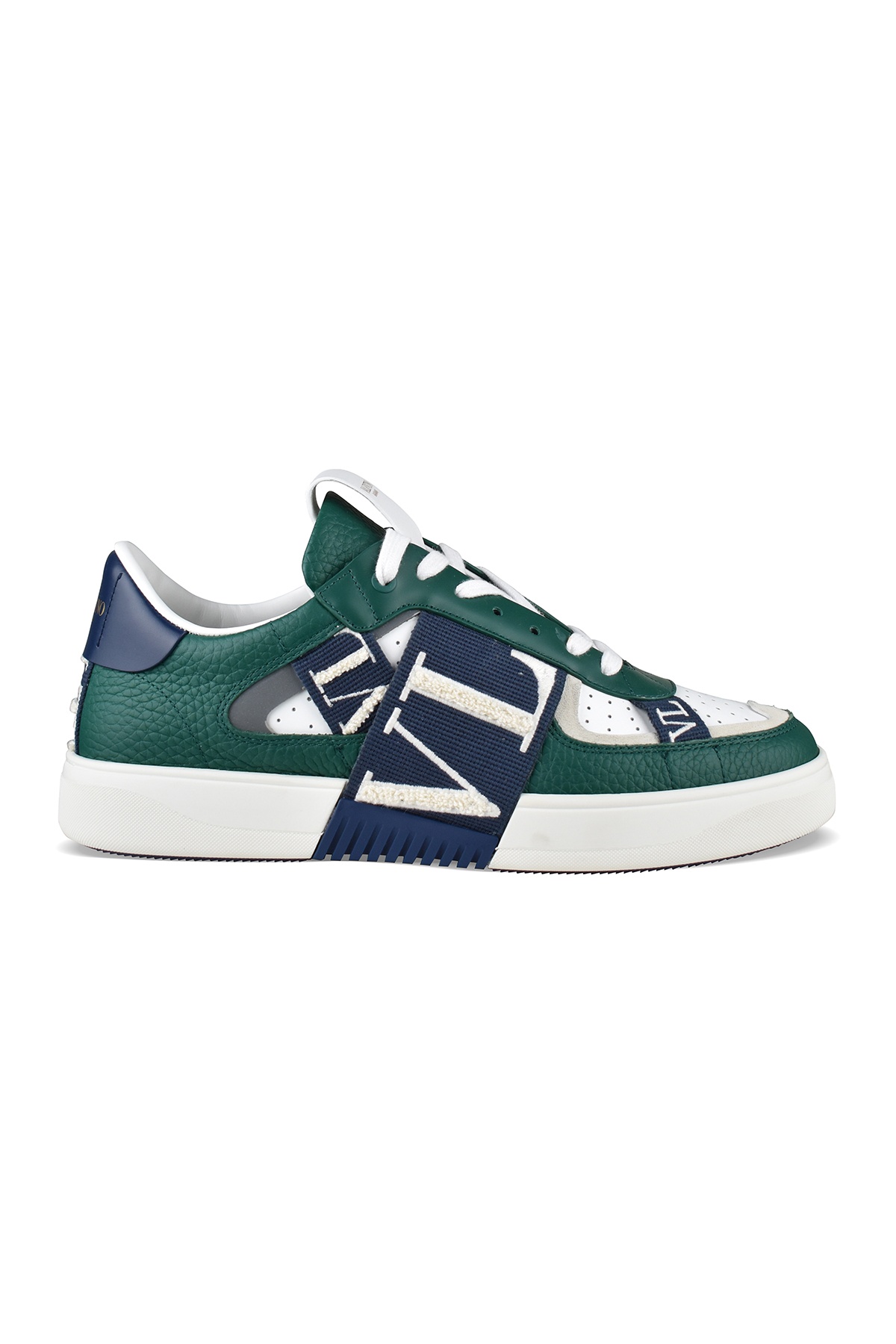 Valentino VL7N sneakers in white and green leather. Seven ribbons with VLTN logo in white and white with laces. White leather counter with Valentino logo. Valentino logo tongue. Rubber sole. 100% calf leather. Made in Italy.