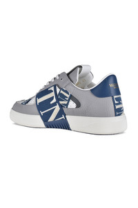 Valentino VL7N sneakers in grey-white and navy-blue leather. Seven ribbons with VLTN logo in white and blue with laces. Navy blue leather counter with Valentino logo. Valentino logo tongue. Rubber sole. 100% calf leather. Made in Italy.