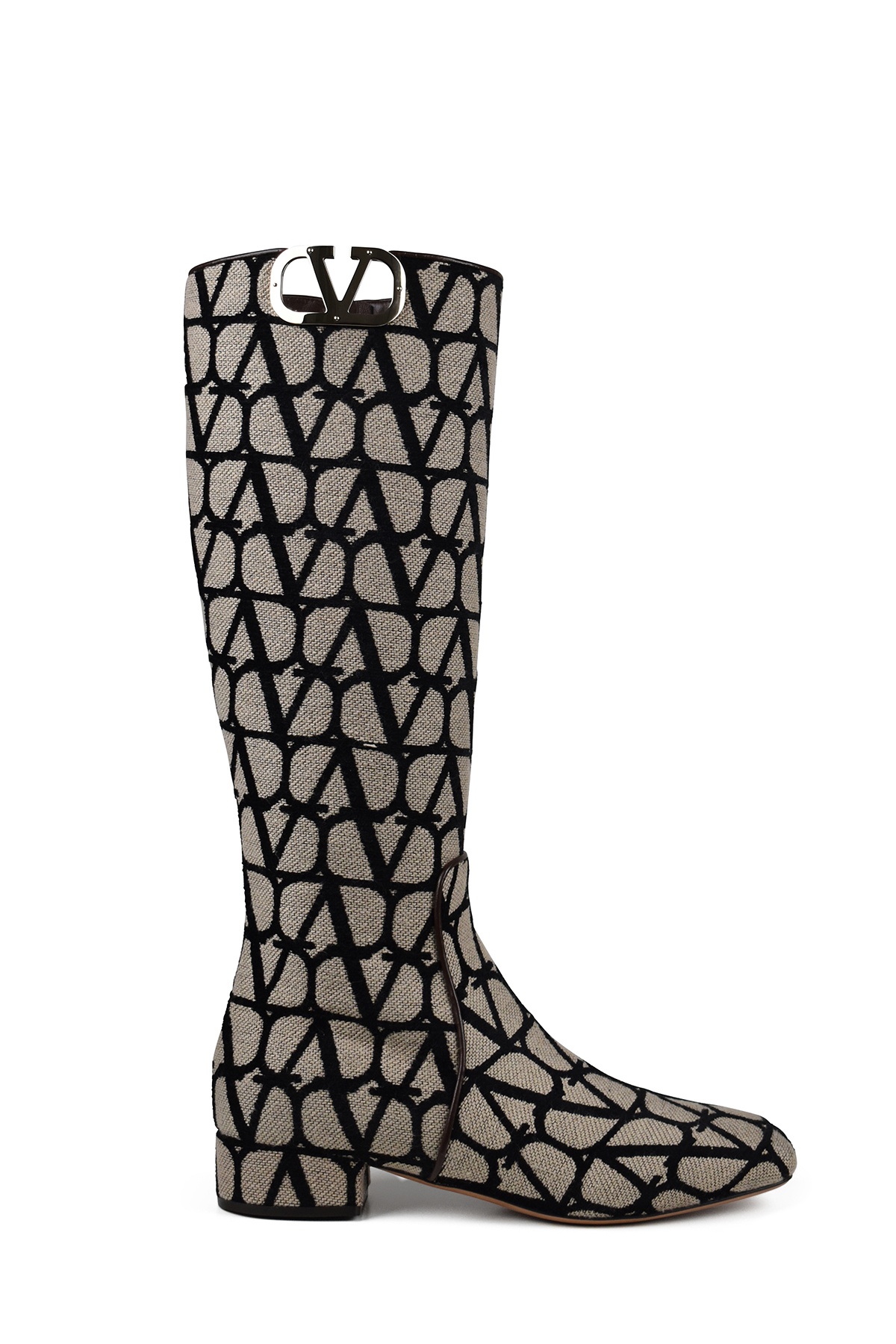 VLogo boots in canvas Iconograph Valentino. Beige and black "V" monogram print on the boot. V logo on the top. Leather embellishments. Side zipper closure. Rounded toe. 3 cm heel. Made in Italy.