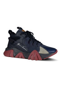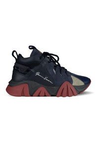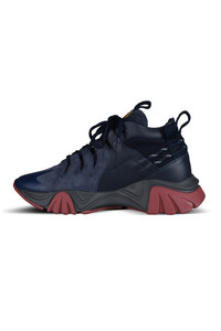 Versace Squalo sneakers in midnight blue leather and gray suede. Blue and burgundy thick rubber sole. Versace inscription on the front tongue. Signature on the outer side. Lace-up closure. Round toe. Made in Italy.