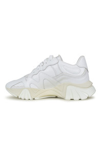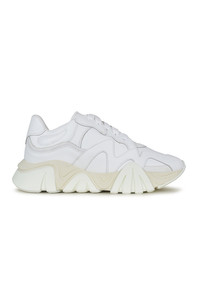 Versace Squalo sneakers in white leather and canvas. Versace lettering on the tongue. White and beige rubber sole. Made in Italy.