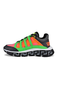 Trigreca Versace sneakers in green, red and pink suede. Printed with Milan city coordinates. Black lace-up closure with green and gray logo. Grey suede inserts. Trigreca print on tongue and counter. Greca rubber soles. Made in Italy.