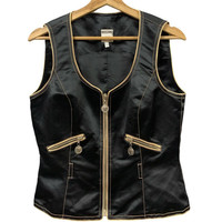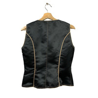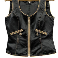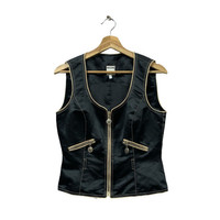 Pre-worn Moschino jeans vest zipper jacket. Marked as size USA 10. Material 100% polyester, nylon + fodera. Lining 100% rayon. Made in Italy. Missing waist belt.