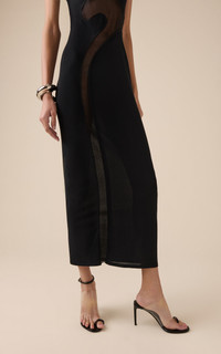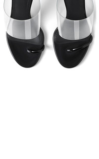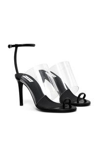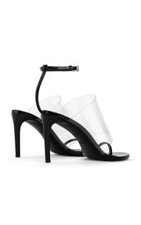 Founded by Azzedine Alaia, today the maison, under the direction of Pieter Mulier, continues the revered couturier's uncompromising vision which champions masterful cuts that accentuate the female form. The house is perhaps best known for its statement bags, edgy footwear, and laser-cut accessories. These sleek, barely-there sandals features a wide, transparent plexi strap and minimal leather strapping. Asymmetrical in design, the right foot features an ankle strap. PRODUCT DETAILS - Heel measures approximately 90mm / 3.5" - Slip on - Composition: calfskin leather, transparent polyurethane - Made in Italy