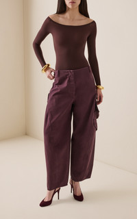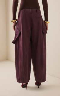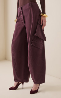 A master of ingenious silhouetting, Pieter Mulier gives his one-of-a-kind creations a sculptural twist for the SF25 Archetypes collection. Cut from washed cotton, these cargo pants have wide barrel legs designed to sit low on the hip. PRODUCT DETAILS - Pre-Fall '25 - Zip fastening - Composition: 100% cotton; Pocket Lining: 97% cotton, 3% elastane - Designer color: Eggplant - Dry clean - Made in Italy SIZE & FIT - Our model is wearing a size FR 34 - Model is 5'10" with a 30" bust, 24" waist, and 34" hip - Designed for a relaxed fit