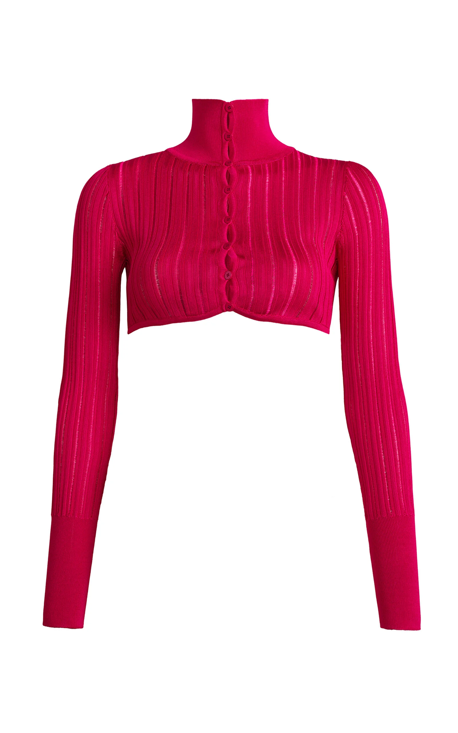 Founded by Azzedine Alaia, today the maison, under the direction of Pieter Mulier, continues the revered couturier's uncompromising vision which champions masterful cuts that accentuate the female form. With the high neck, button down front, and hot pink color, Alaia modernizes the cropped cardigan. Style with a matching pink skirt and the label's wedges for a just off the runway look. PRODUCT DETAILS - Resort - Button fastenings through front - Composition: 97% Viscose, 2% Polyamide, 1% Polyurethane; Secondary Fabric: 95% Viscose, 4% Polyamide, 1% Polyurethane; Other: 100% Viscose - Dry clean - Imported SIZE & FIT - Our model is wearing a size FR 34 - Our model is 5'11" with a 31.5" bust, 23" waist, and 34.5" hip - Fits true to size, our fit specialist recommends taking your normal size - Designed for a slim fit