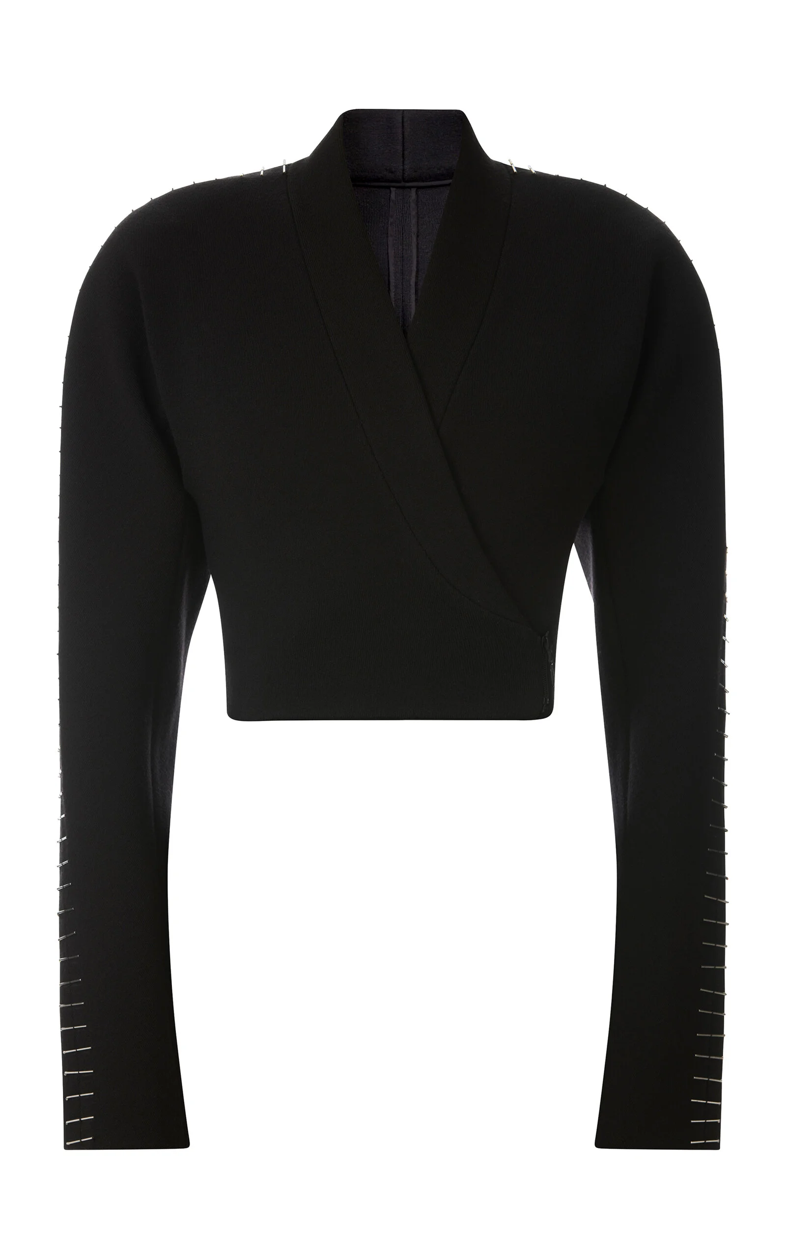 In the hospitable tradition of the late Azzedine Alaia, Pieter Mulier invited industry insiders inside his Antwerp home to view the Fall '23 collection — his latest tribute to the sculptural, empowering codes of the Parisian Maison. It was Mulier’s most personal spin on Alaia’s celebrated cornerstones, and a promising glimpse into the house’s future. Knit from a wool-blend, this cropped jacket has a fitted wrap silhouette with pins embroidered along the shoulders. Wear it over the matching dress from the runway. PRODUCT DETAILS - Zip fastening through front - Composition: 87% virgin wool, 13% polyester - Dry clean - Made in France SIZE & FIT - Model is wearing a size FR 36 - Designed for a slim fit