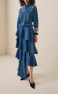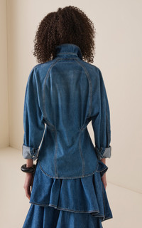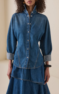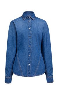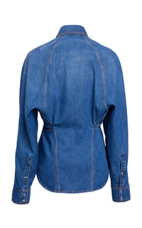Founded by Azzedine Alaia, today the maison, under the direction of Pieter Mulier, continues the revered couturier's uncompromising vision which champions masterful cuts that accentuate the female form. This snap-down shirt has a curved design made from non-stretch denim with rounded raglan shoulders and a tapered waist. PRODUCT DETAILS - Pre-Fall '25 - Snap fastening - Composition: 100% cotton - Designer color: Mineral Blue - Dry clean - Made in Italy SIZE & FIT - Our model is wearing a size FR 34 - Model is 5'10" with a 31" bust, 23.5" waist, and 33.5" hip - Designed for a regular fit