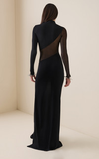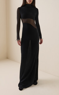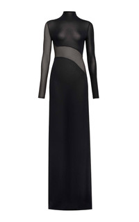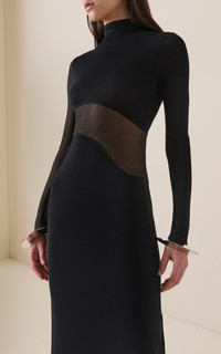 Founded by Azzedine Alaia, today the maison, under the direction of Pieter Mulier, continues the revered couturier's uncompromising vision which champions masterful cuts that accentuate the female form. Inspired by the sculptural works of artist Mark Manders, the Maison interrupts this maxi’s sleek frame with a curved panel that reaches across the sleeve. The style is made from sculpting jersey and mesh, cut to a close fit through the frame. Wear with ballet flats or heels, depending on the occasion. PRODUCT DETAILS - Fall/Winter ‘25 - Slip on - Composition: 94% viscose, 6% polyester - Dry clean - Designer Color: Noir Alaia - Made in Italy SIZE & FIT - Our model is wearing a size FR 34 - Model is 5'10" with a 30" bust, 24" waist, and 34" hip