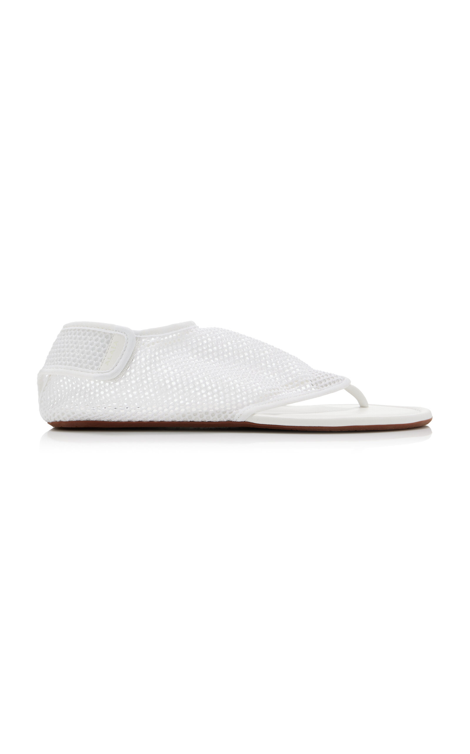 Founded by Azzedine Alaia, today the maison, under the direction of Pieter Mulier, continues the revered couturier's uncompromising vision which champions masterful cuts that accentuate the female form. The house is perhaps best known for its statement bags, edgy footwear, and laser-cut accessories. These thong sandals feature a fishnet construction for a "naked" feel. PRODUCT DETAILS - Buckle fastening - Composition: mesh - Designer color: Optic White - Made in Italy