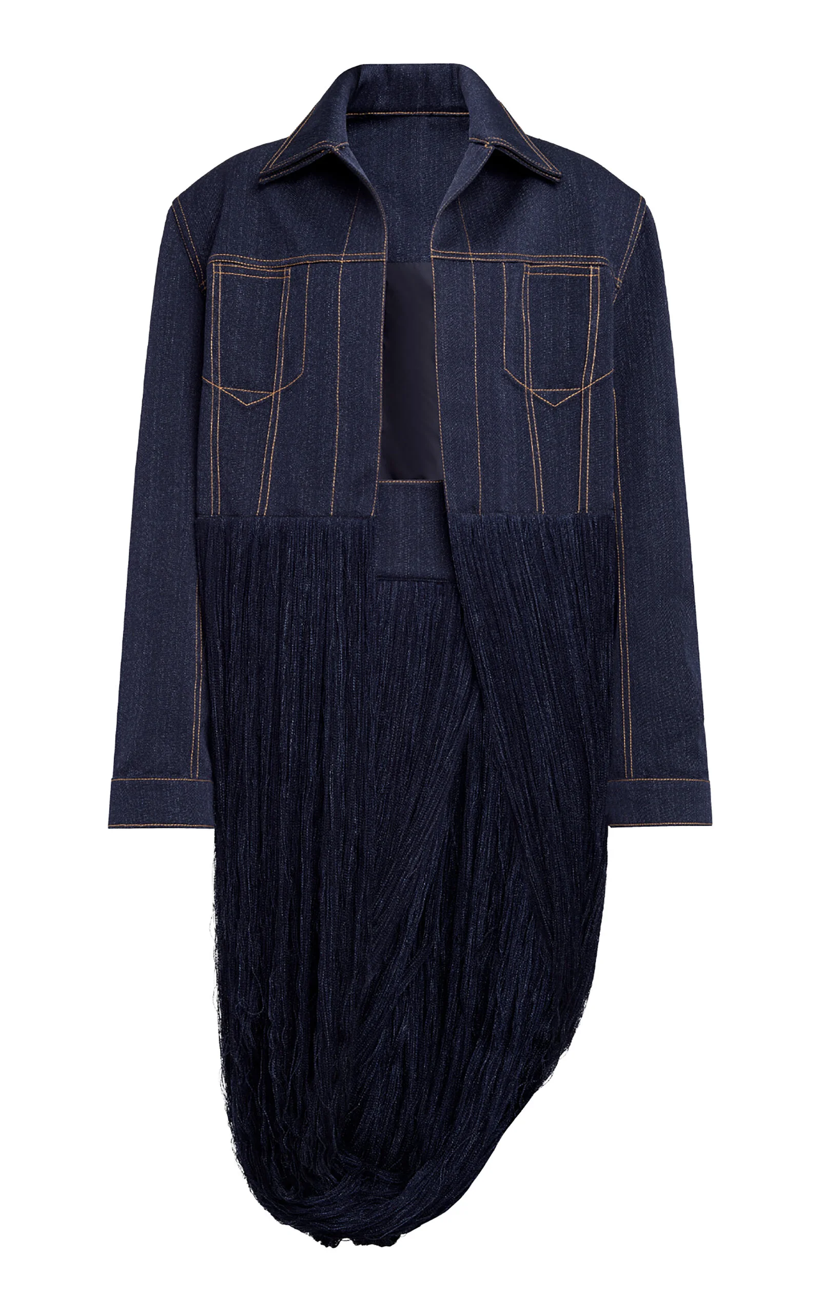 Founded by Azzedine Alaia, today the maison, under the direction of Pieter Mulier, continues the revered couturier's uncompromising vision which champions masterful cuts that accentuate the female form. This jacket is crafted with a denim-effect double twisted merino wool twill upper with embroidered heavy gauge fringe arranged in a 'Infinity' hem. PRODUCT DETAILS - Fall/Winter '24 - Slip on - Composition: 100% Wool, Lining: 100% polyamide - Designer color: Nuit - Dry clean - Imported SIZE & FIT - Our model is wearing a size FR 34 - Model is 5'11" with a 31.5" bust, 23" waist, and 34.5" hip - Designed for a slim fit