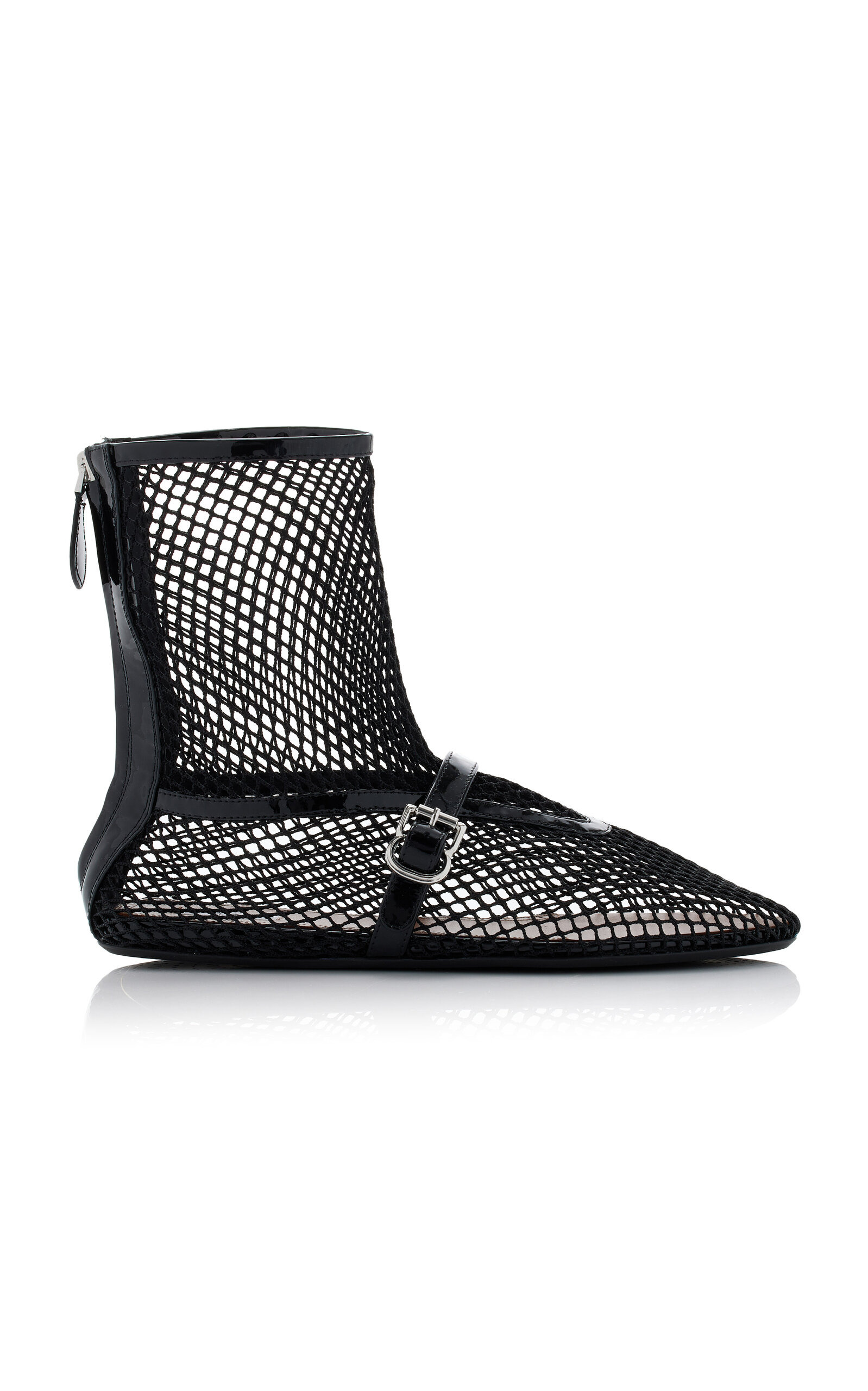 Founded by Azzedine Alaia, today the maison, under the direction of Pieter Mulier, continues the revered couturier's uncompromising vision which champions masterful cuts that accentuate the female form. The house is perhaps best known for its statement bags, edgy footwear, and laser-cut accessories. These flats are made from eyelet mesh trimmed with patent leather into a mary jane silhouette defined by its single strap buckle fastening. Try yours with a tailored suiting set. PRODUCT DETAILS - Zip fastening along back - Composition: mesh, leather - Made in Italy
