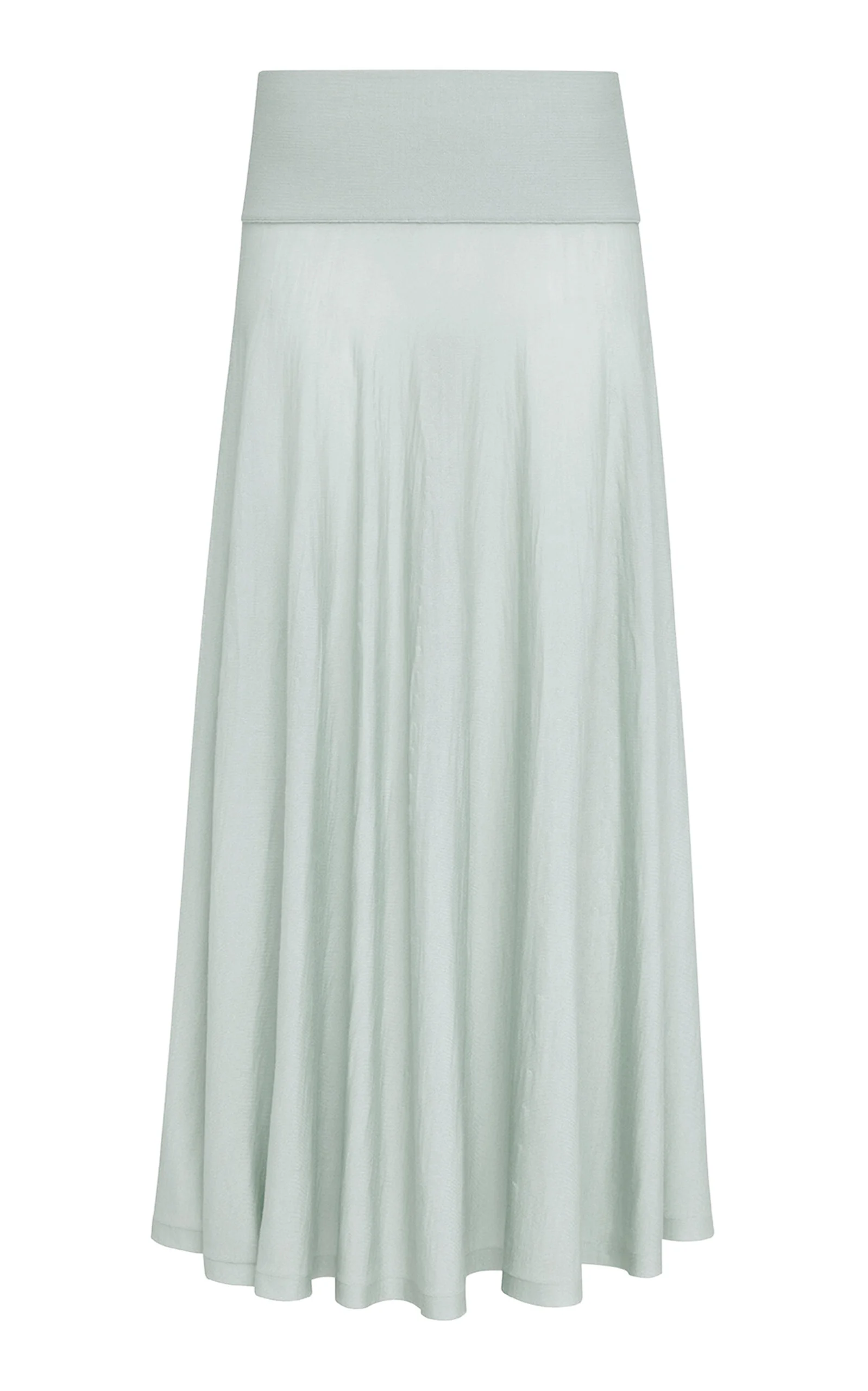 A master of ingenious silhouetting, Pieter Mulier gives his one-of-a-kind creations a sculptural twist for the SF25 Archetypes collection. This maxi skirt has a classic A-line cut finely knit from light, sheer wool with an ultra-wide elastic waistband designed to sit low on the hip. Wear it with the matching top. PRODUCT DETAILS - Pre-Fall '25 - Pull on - Composition: 100% wool; Waistband: 91% wool, 8% polyamide, 1% polyurethane - Designer color: Almond Green - Dry clean - Made in Italy SIZE & FIT - Our model is wearing a size FR 34 - Model is 5'10" with a 30" bust, 24" waist, and 34" hip - Designed for a regular fit