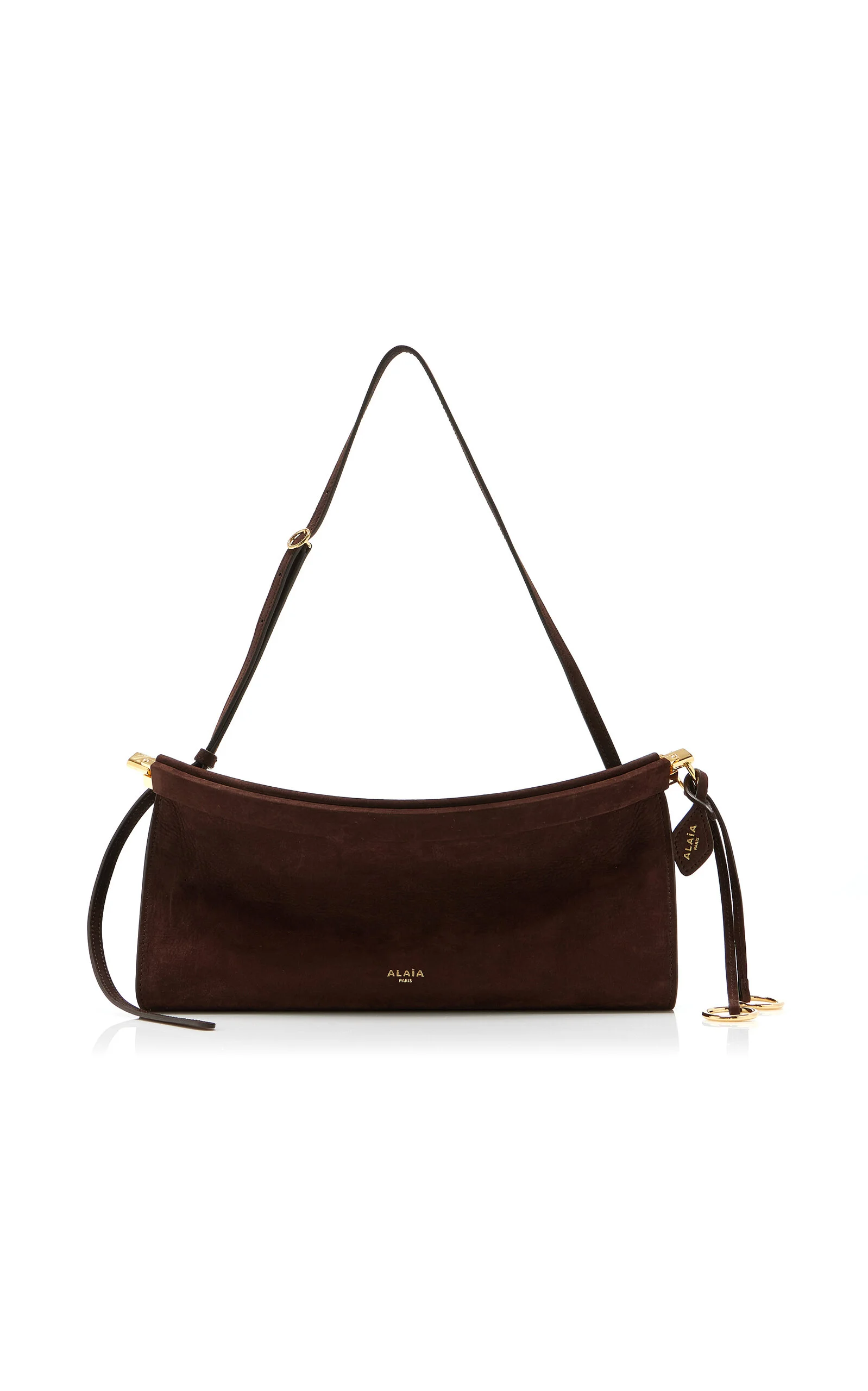 Founded by Azzedine Alaia, today the maison, under the direction of Pieter Mulier, continues the revered couturier's uncompromising vision which champions masterful cuts that accentuate the female form. The house is perhaps best known for its statement bags, edgy footwear, and laser-cut accessories. 'Le Click' has a curved East/West silhouette designed to hug the body. It features a signature folded detail at the bottom and decorative ties with metallic rings. Carry it at the shoulder or crossbody thanks to the adjustable strap. PRODUCT DETAILS - Hinge fastening - Composition: nubuck calfskin leather - Made in Italy SIZE & FIT - This item measures 30 x 14 x 9cm