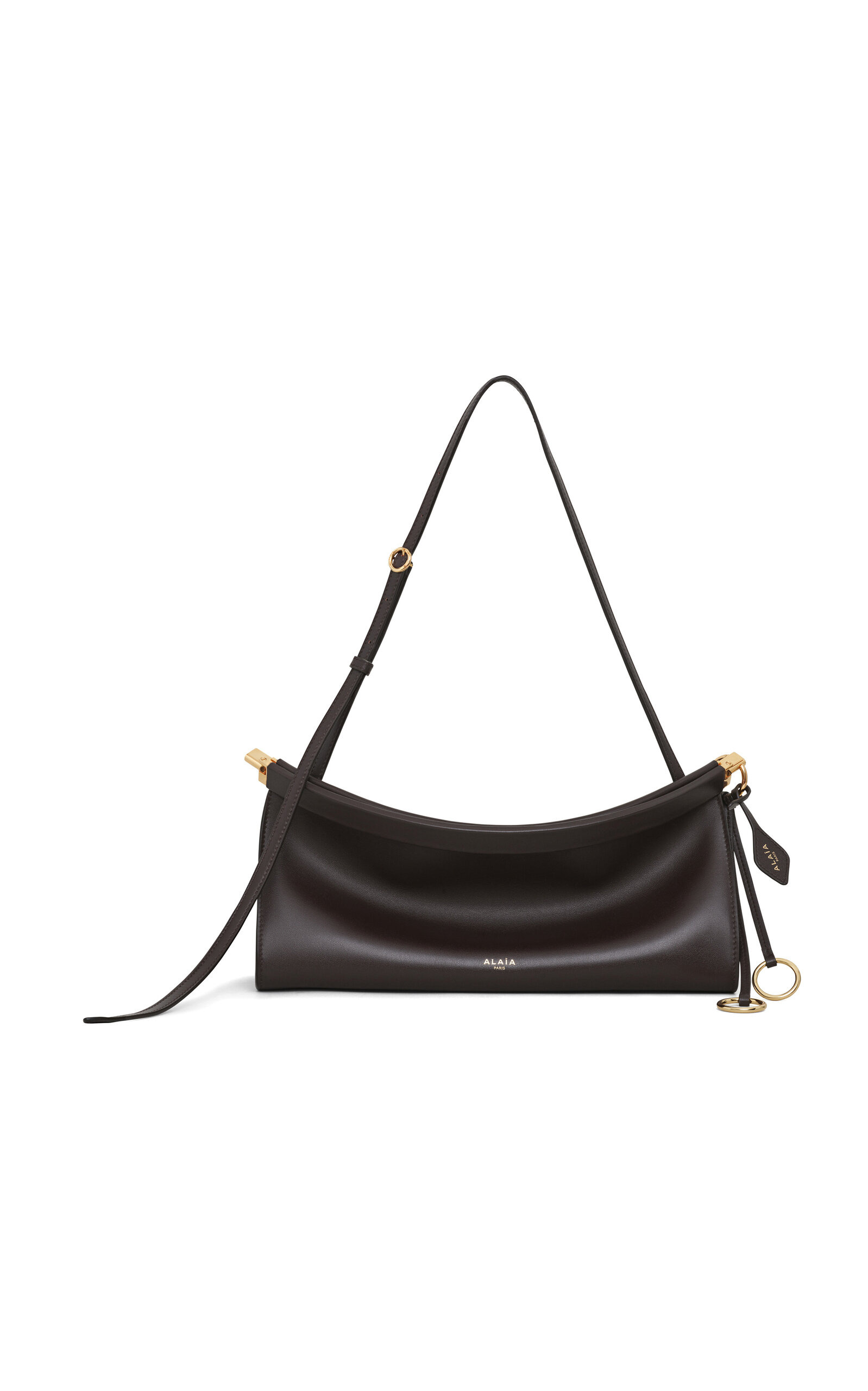 Founded by Azzedine Alaia, today the maison, under the direction of Pieter Mulier, continues the revered couturier's uncompromising vision which champions masterful cuts that accentuate the female form. The house is perhaps best known for its statement bags, edgy footwear, and laser-cut accessories. 'Le Click' has a curved East/West silhouette designed to hug the body. It features a signature folded detail at the bottom and decorative ties with metallic rings. Carry it at the shoulder or crossbody thanks to the adjustable strap. PRODUCT DETAILS - Hinge fastening - Composition: nubuck calfskin leather - Made in Italy SIZE & FIT - This item measures 30 x14 x 9