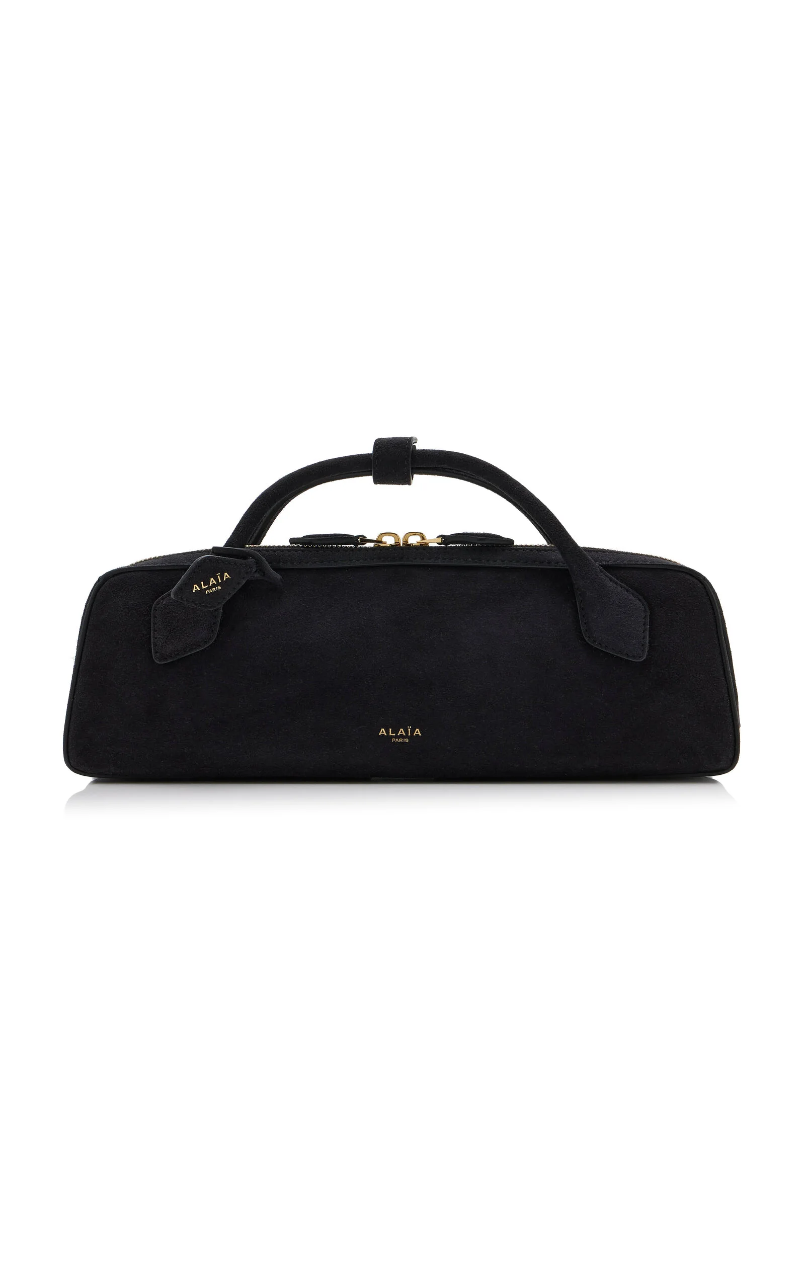 Founded by Azzedine Alaia, today the maison, under the direction of Pieter Mulier, continues the revered couturier's uncompromising vision which champions masterful cuts that accentuate the female form. The house is perhaps best known for its statement bags, edgy footwear, and laser-cut accessories. This clutch version of the iconic ‘Le Teckel’ is made from velvety and supple goatskin suede. Its elongated profile is suspended from a rolled top handle, and opens easily with a double-zip fastening. PRODUCT DETAILS - Zip fastening - Composition: 100% goat suede - Made in Italy SIZE & FIT - This item measures approximately 12.2 x 4 x 2.8"