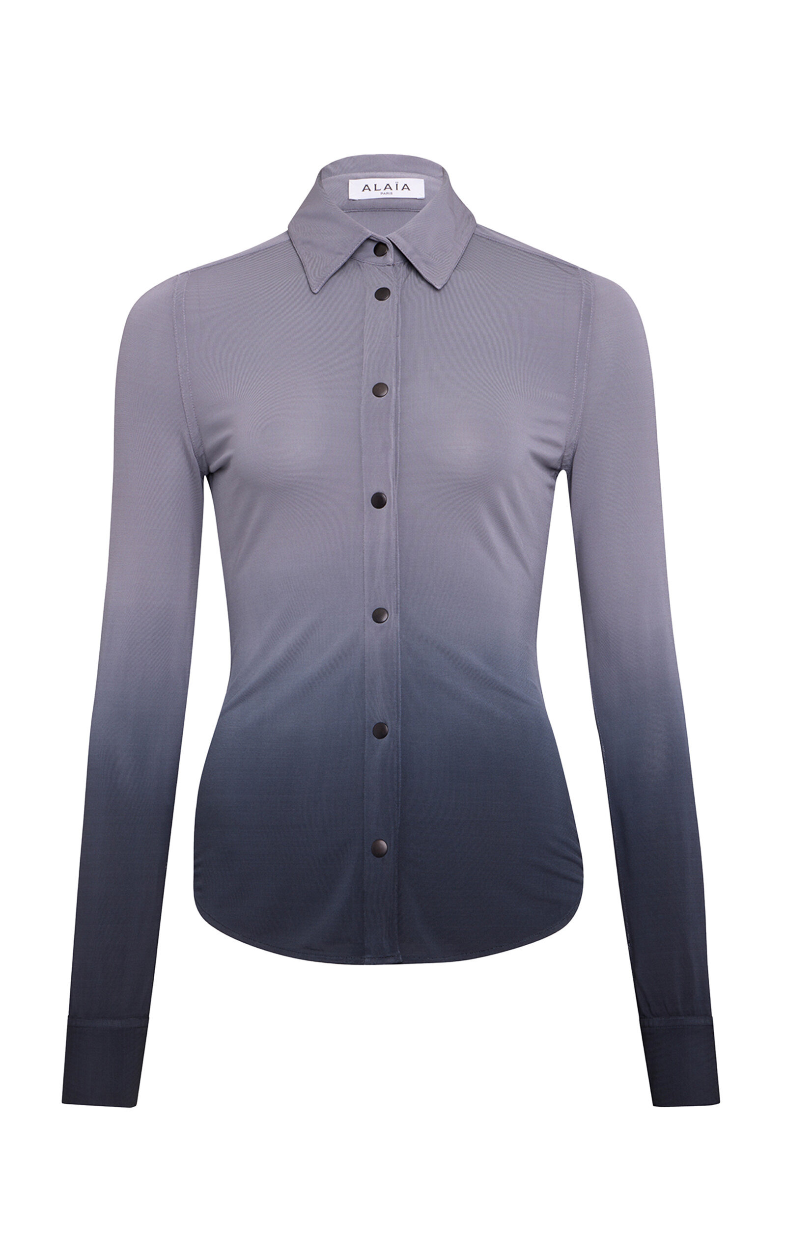 Founded by Azzedine Alaia, today the maison, under the direction of Pieter Mulier, continues the revered couturier's uncompromising vision which champions masterful cuts that accentuate the female form. This button-front shirt has a fitted cut made from soft, stretchy jersey with an ombre print. Pair it with the matching skirt. PRODUCT DETAILS - Pre-Fall '25 - Button fastening - Composition: 96% viscose, 4% elastane - Designer color: Anthracite/ Dark Grey - Dry clean - Made in Italy
