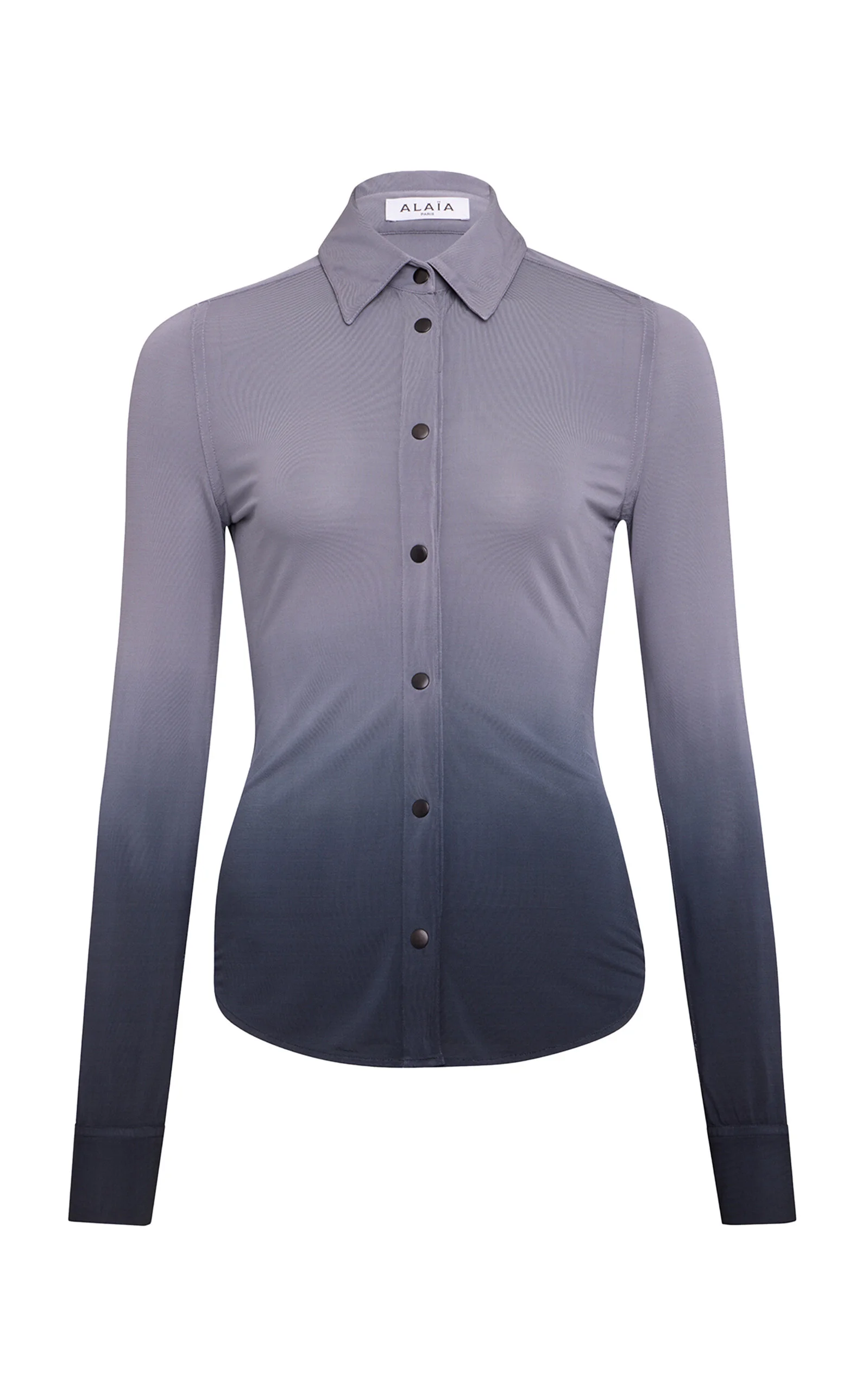 A master of ingenious silhouetting, Pieter Mulier gives his one-of-a-kind creations a sculptural twist for the SF25 Archetypes collection. This button-front shirt has a fitted cut made from soft, stretchy jersey with an ombre print. Pair it with the matching skirt. PRODUCT DETAILS - Pre-Fall '25 - Button fastening - Composition: 96% viscose, 4% elastane - Designer color: Anthracite/ Dark Grey - Dry clean - Made in Italy