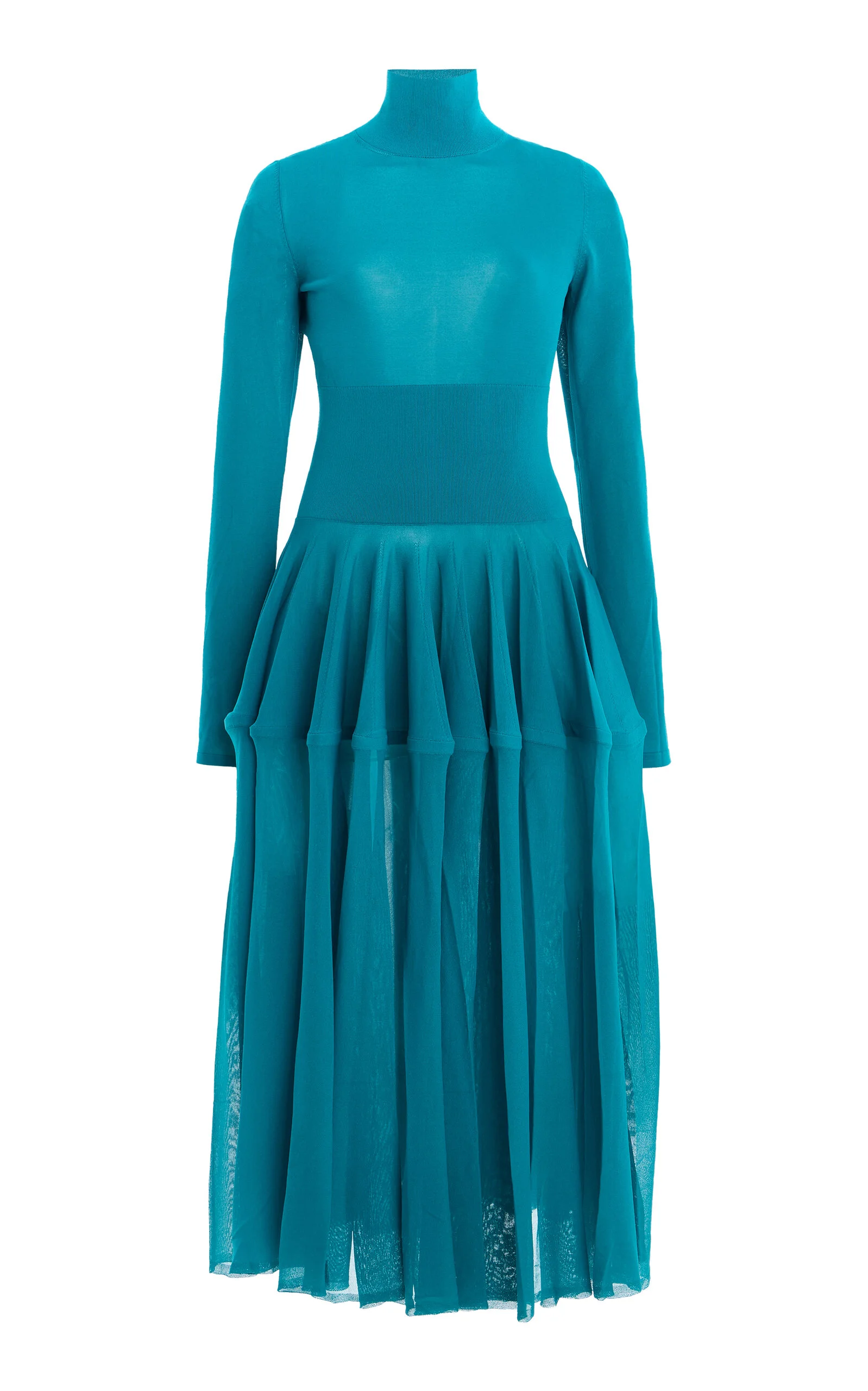 Founded by Azzedine Alaia, today the maison, under the direction of Pieter Mulier, continues the revered couturier's uncompromising vision which champions masterful cuts that accentuate the female form. Crafted from slinky knit jersey, this dress shows very little skin, taking to accentuating the form in fit and silhouette. It features slender sleeves, a high neck, and structured peplum flare. PRODUCT DETAILS - Resort '26 - Slip on - Composition: 68% Viscose, 31% Polyamide, 1% Elastane - Designer color: Turquoise - Dry clean only - Made in Italy SIZE & FIT - Our model is wearing a size FR 36 - Model is 5'11" with a 30" bust, 24" waist, and 24" hip - Designed for a slim fit