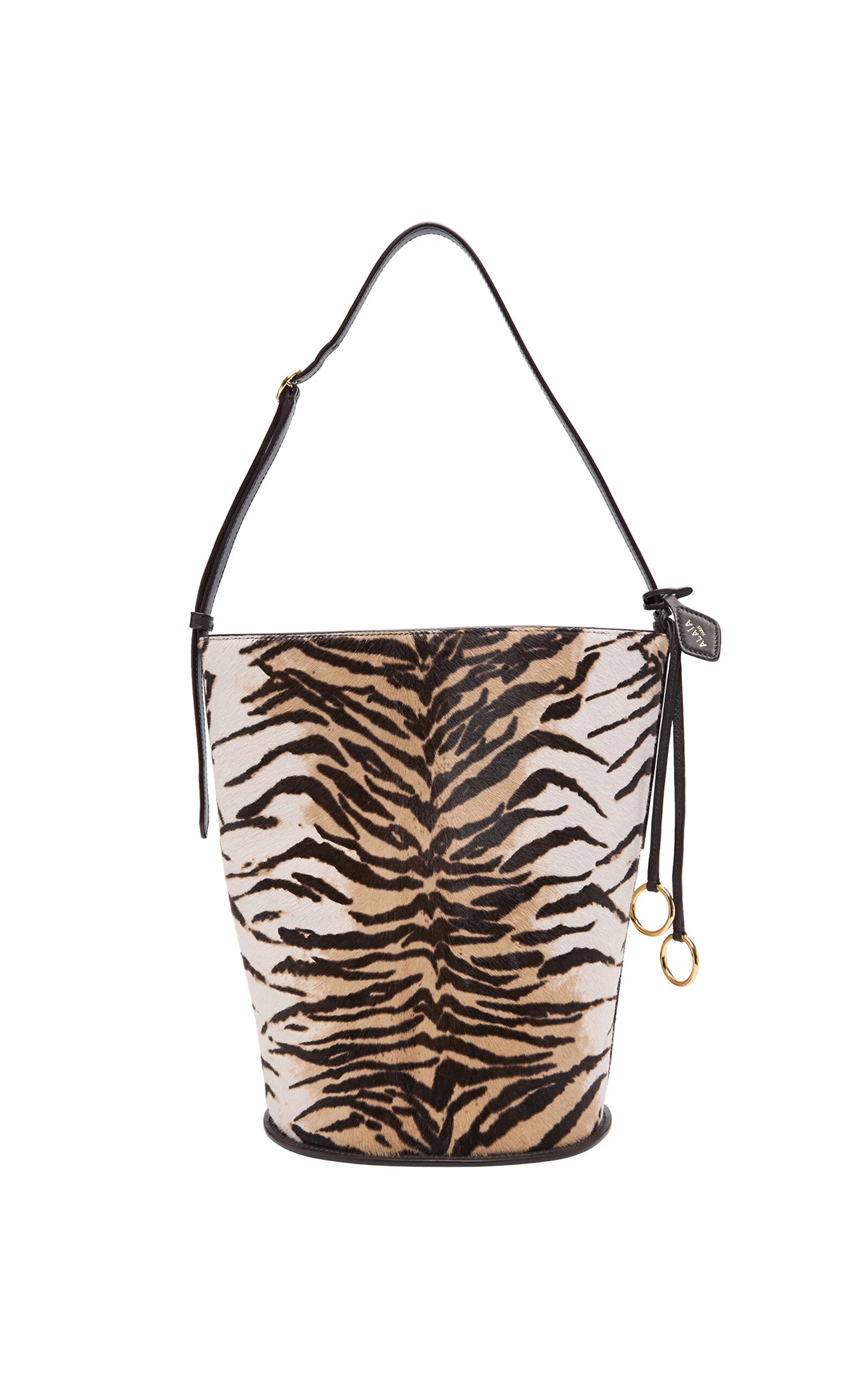 Founded by Azzedine Alaia, today the maison, under the direction of Pieter Mulier, continues the revered couturier's uncompromising vision which champions masterful cuts that accentuate the female form. The house is perhaps best known for its statement bags, edgy footwear, and laser-cut accessories. This slouchy bucket bag has a generous silhouette made from textured pony hair leather boasting bold tiger stripes. It's finished with signature ring metal charms and tag. PRODUCT DETAILS - Zip fastening - Composition: 100% calf hair leather - Made in Italy