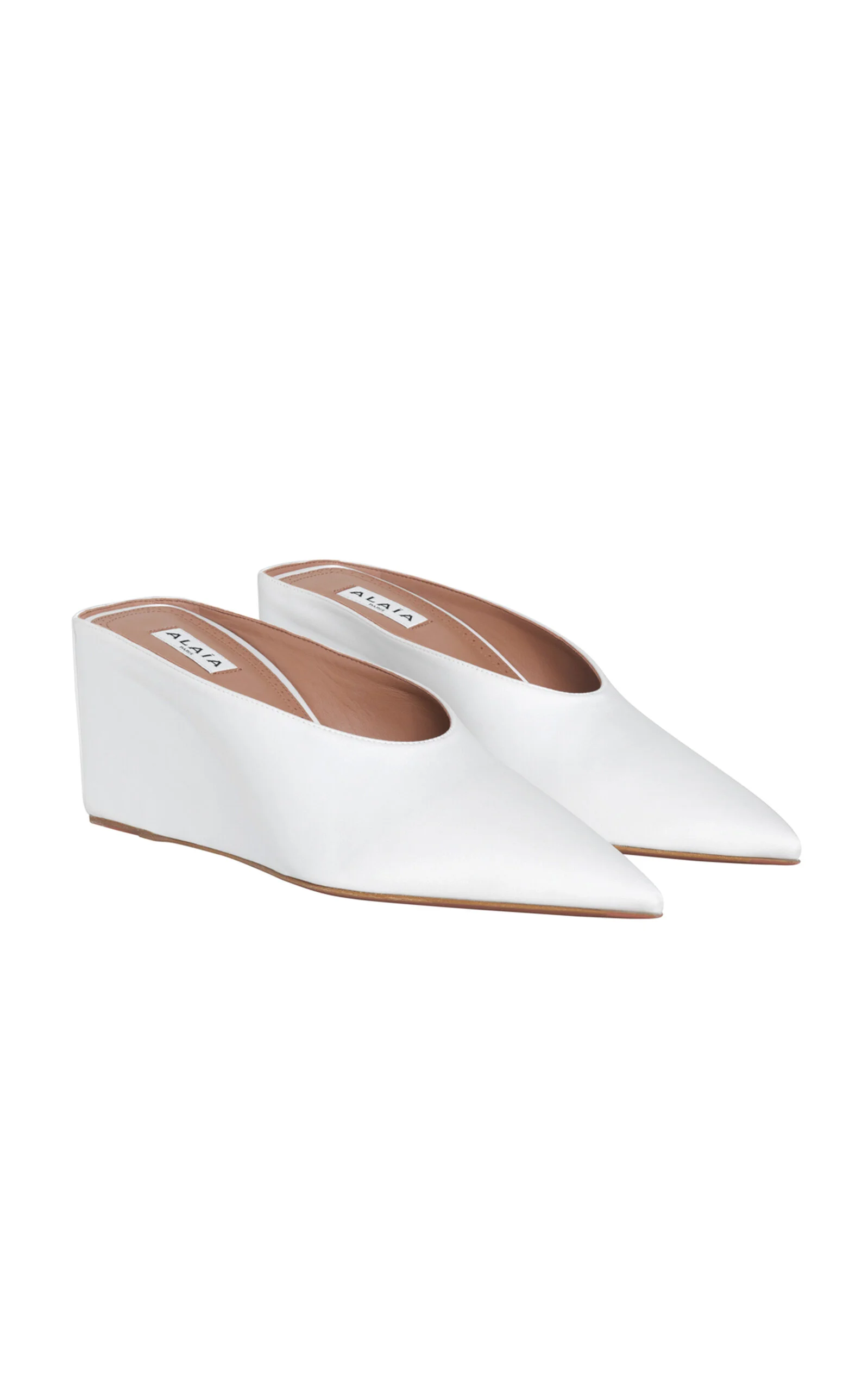 Founded by Azzedine Alaia, today the maison, under the direction of Pieter Mulier, continues the revered couturier's uncompromising vision which champions masterful cuts that accentuate the female form. The house is perhaps best known for its statement bags, edgy footwear, and laser-cut accessories. These sleek and minimal mules are crafted from a stretch-satin fabric with a distinctive cubic wedge heel and pointed toe. PRODUCT DETAILS - Heel measures approximately 75mm / 3" - Slip on - Composition: satin stretch fabric - Made in Italy