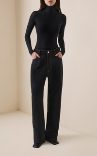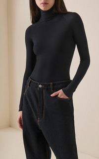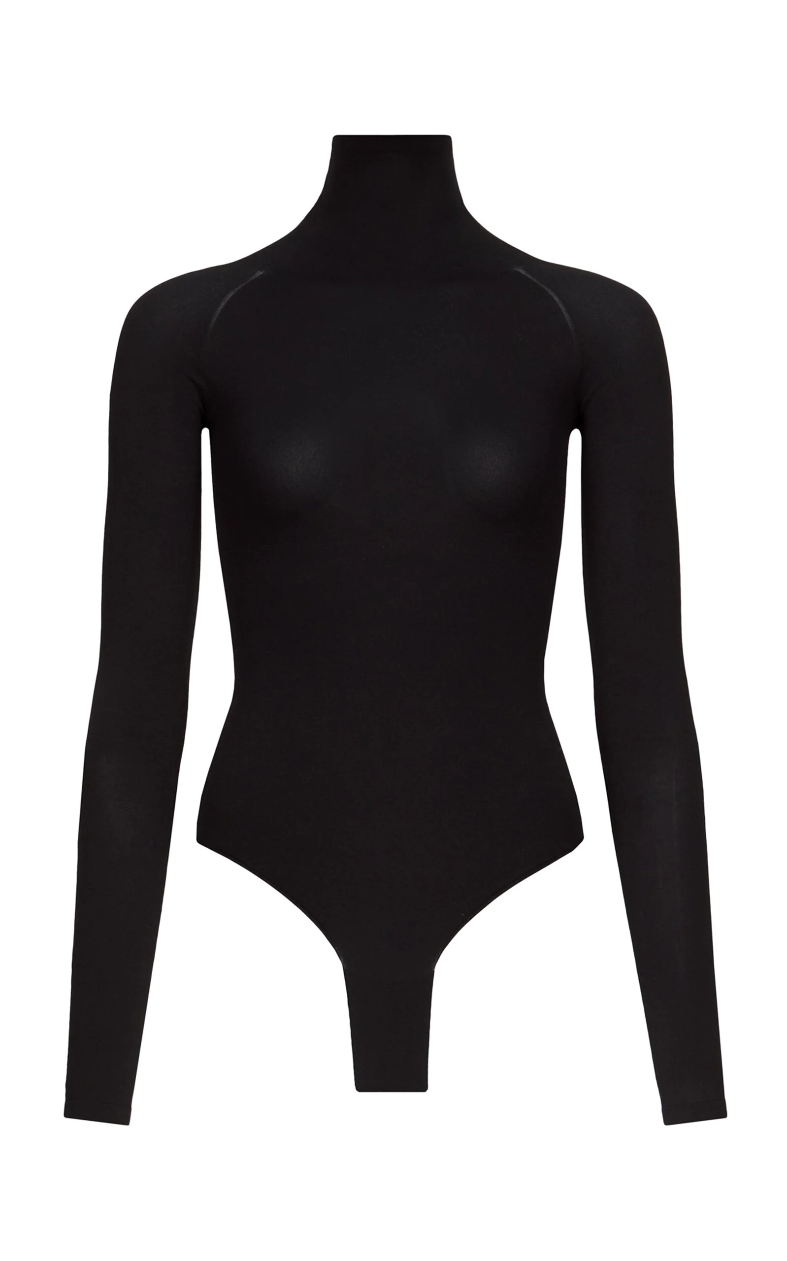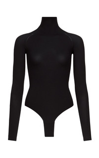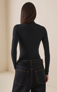 Founded by Azzedine Alaia, today the maison, under the direction of Pieter Mulier, continues the revered couturier's uncompromising vision which champions masterful cuts that accentuate the female form. Employing a sculpting technical jersey, the label constructs this bodysuit with a high neck, long sleeves and a ‘Second Skin’ fit. Tuck inside relaxed jeans, tailored pants or textured midis. PRODUCT DETAILS - Fall/Winter ‘25 - Snap fastening - Composition: 75% polyamide, 25% elastane - Dry clean - Designer Color: Noir Alaia - Made in Italy SIZE & FIT - Our model is wearing a size FR 34 - Model is 5'10" with a 31" bust, 23.5" waist, and 33.5" hip