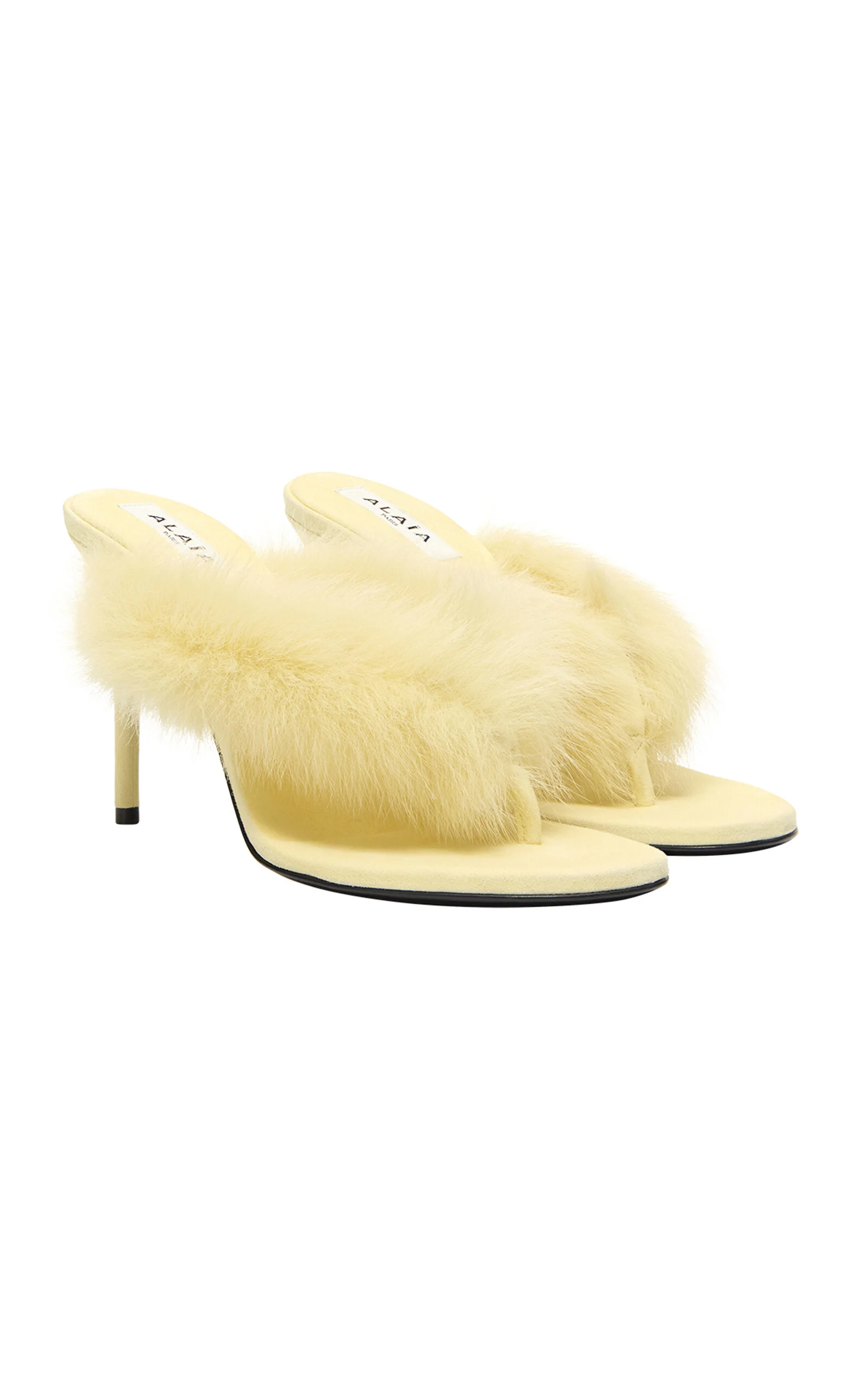 Founded by Azzedine Alaia, today the maison, under the direction of Pieter Mulier, continues the revered couturier's uncompromising vision which champions masterful cuts that accentuate the female form. The house is perhaps best known for its statement bags, edgy footwear, and laser-cut accessories. These round-toe sandals are made from soft suede with a padded thong strap covered in fluffy shearling. PRODUCT DETAILS - Heel height measures 90mm/ 3.5" - Slip on - Composition: suede; Trim: shearling - Made in Italy