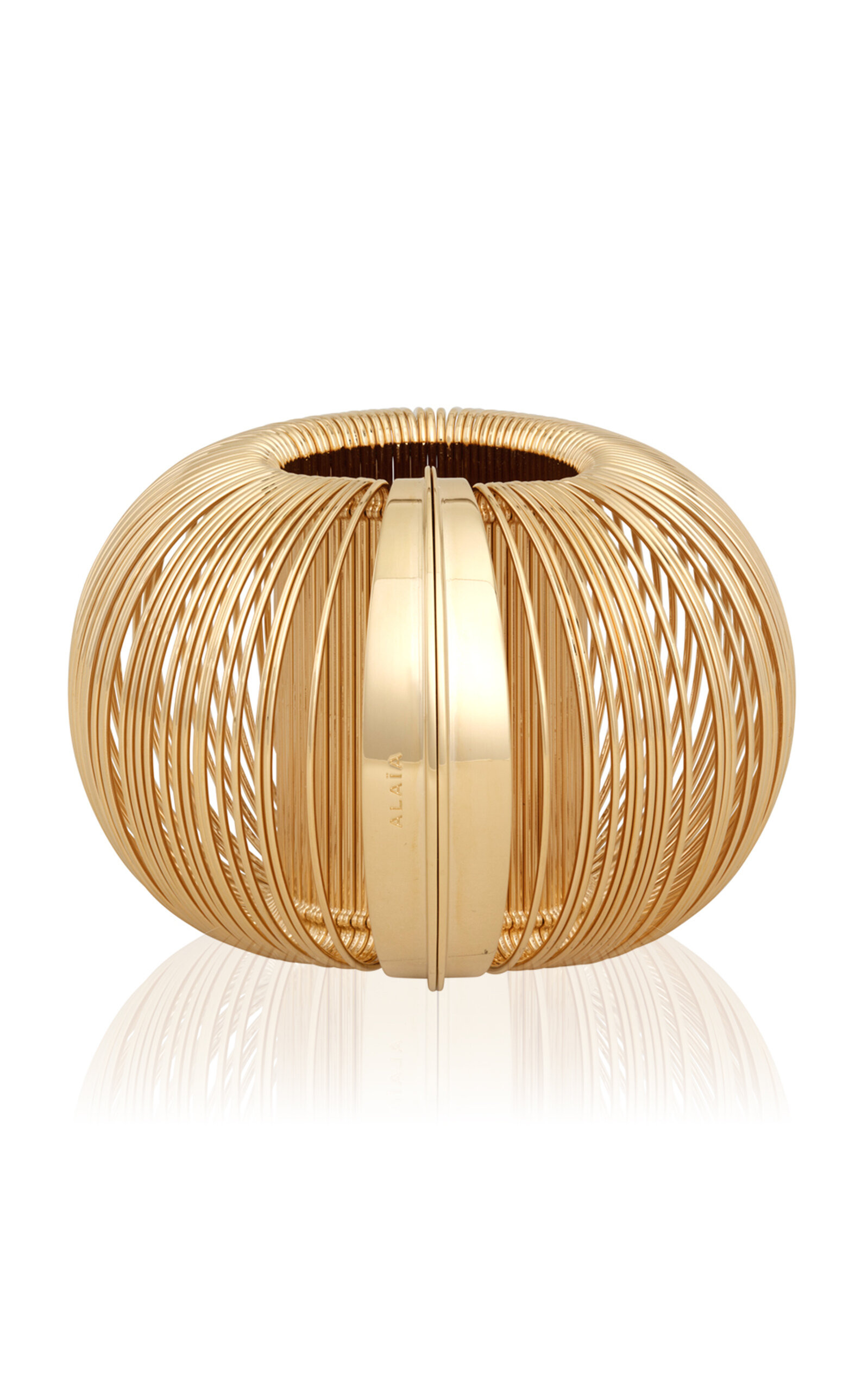 Founded by Azzedine Alaia, today the maison, under the direction of Pieter Mulier, continues the revered couturier's uncompromising vision which champions masterful cuts that accentuate the female form. The house is perhaps best known for its statement bags, edgy footwear, and laser-cut accessories. The 'Slinky' cuff features a domed silhouette made from gold-plated stainless steel. PRODUCT DETAILS - Magnetic fastening - Composition: stainless steel - Made in Italy SIZE & FIT - Length: 9cm