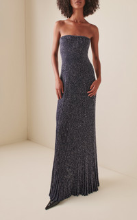 Founded by Azzedine Alaia, today the maison, under the direction of Pieter Mulier, continues the revered couturier's uncompromising vision which champions masterful cuts that accentuate the female form. This strapless dress is features a ribbed-knit texture that transitions to pleats as it edges towards the floor-grazing hem. PRODUCT DETAILS - Resort '26 - Slip on - Composition: 55% Polyamide, 45% Polyester - Designer color: Marine - Dry clean only - Made in Italy SIZE & FIT - Our model is wearing a size FR 36 - Model is 5'11" with a 30" bust, 24" waist, and 24" hip - Designed for a slim fit