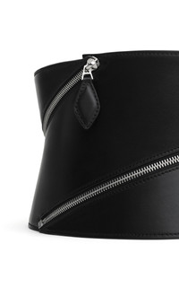 Founded by Azzedine Alaia, today the maison, under the direction of Pieter Mulier, continues the revered couturier's uncompromising vision which champions masterful cuts that accentuate the female form. The house is perhaps best known for its statement bags, edgy footwear, and laser-cut accessories. An iconic brand signature, this leather corset belt has an oversized silhouette punctuated by a silver zipper. Use it to create or enhance an hourglass figure. PRODUCT DETAILS - Zip fastening - Composition: calfskin leather - Made in Italy