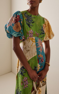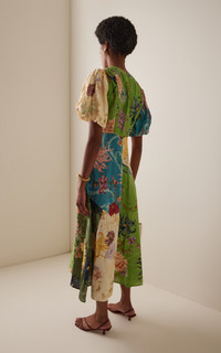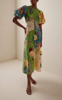 Australian Lesleigh Jermanus continues to deliver a sustainable marriage of femininity and island-ready ease that makes her pieces so covetable. The 'Avery' dress is a spliced design showcasing colorful panels of the label's signature surrealistic imagery, all in airy flax linen. PRODUCT DETAILS - Pre-Fall '25 - Concealed zip fastening along back - Composition: 100% European linen - Dry clean only - Imported SIZE & FIT - Our model is wearing a size AU 6 - Model is 5'10" with a 32" bust, 23.5" waist, and 34.5" hip - Designed for a slim fit