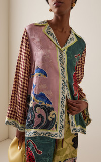 Australian Lesleigh Jermanus continues to deliver a sustainable marriage of femininity and island-ready ease that makes her pieces so covetable. Crafted from silk-blend jacquard, this long sleeve blouse is intended for a loose, airy fit. Pair it with the matching shorts. PRODUCT DETAILS - Pre-Fall '25 - Button fastening through front - Composition: 58% viscose, 42% silk - Dry clean only - Imported SIZE & FIT - Our model is wearing a size AU 6 - Model is 5'10" with a 32" bust, 23.5" waist, and 34.5" hip - Designed for a slim fit