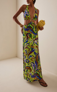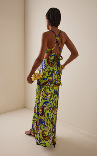 Australian Lesleigh Jermanus continues to deliver a sustainable marriage of femininity and island-ready ease that makes her pieces so covetable. The 'Yvette' features a halter-neck bodice with adjustable cross-over ties at the back and a gold flower ring that connects it to the full-length A-line skirt. PRODUCT DETAILS - Fall '25 - Tie and zip fastening at back - Composition: 100% European flax linen - Designer color: Lime - Dry clean - Imported