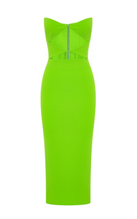 PRODUCT DETAILS - As featured in the Spring Summer '22 lookbook, pair yours with boots to mirror the brand styling - Slim fit, strapless, double cut out, midi hem, lined - Concealed zip fastening along back - This style fits true to size, we suggest taking your normal size - Composition: 63% polyester, 37% acetate; lining 63% polyester, 37% acetate - Dry clean only - Imported SIZE & FIT - Model is wearing a sample size AU 6 - Fits large to size, our fit specialist recommends taking one size down