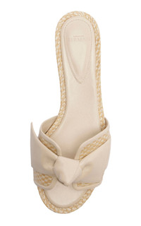 One of Brazil's most esteemed luxury footwear designers, CFDA member Alexandre Birman takes a sophisticated approach to his shoes. The Maxi Clarita flat in raffia combines natural raffia-lined uppers and back with a prominent leather bow. This material interplay highlights the collectiona€™s concept by blending organic textures with a sleek finish. Precise leather trim defines the shape, while the soft insole ensures comfortable wear throughout the day. This adaptable design elegantly fuses rustic charm with refined details for a polished yet effortless style PRODUCT DETAILS - Slip on - Composition: Raffia, Lining Material - Leather, Outsole Material - Raffia & Leather - Color: Shell - Imported