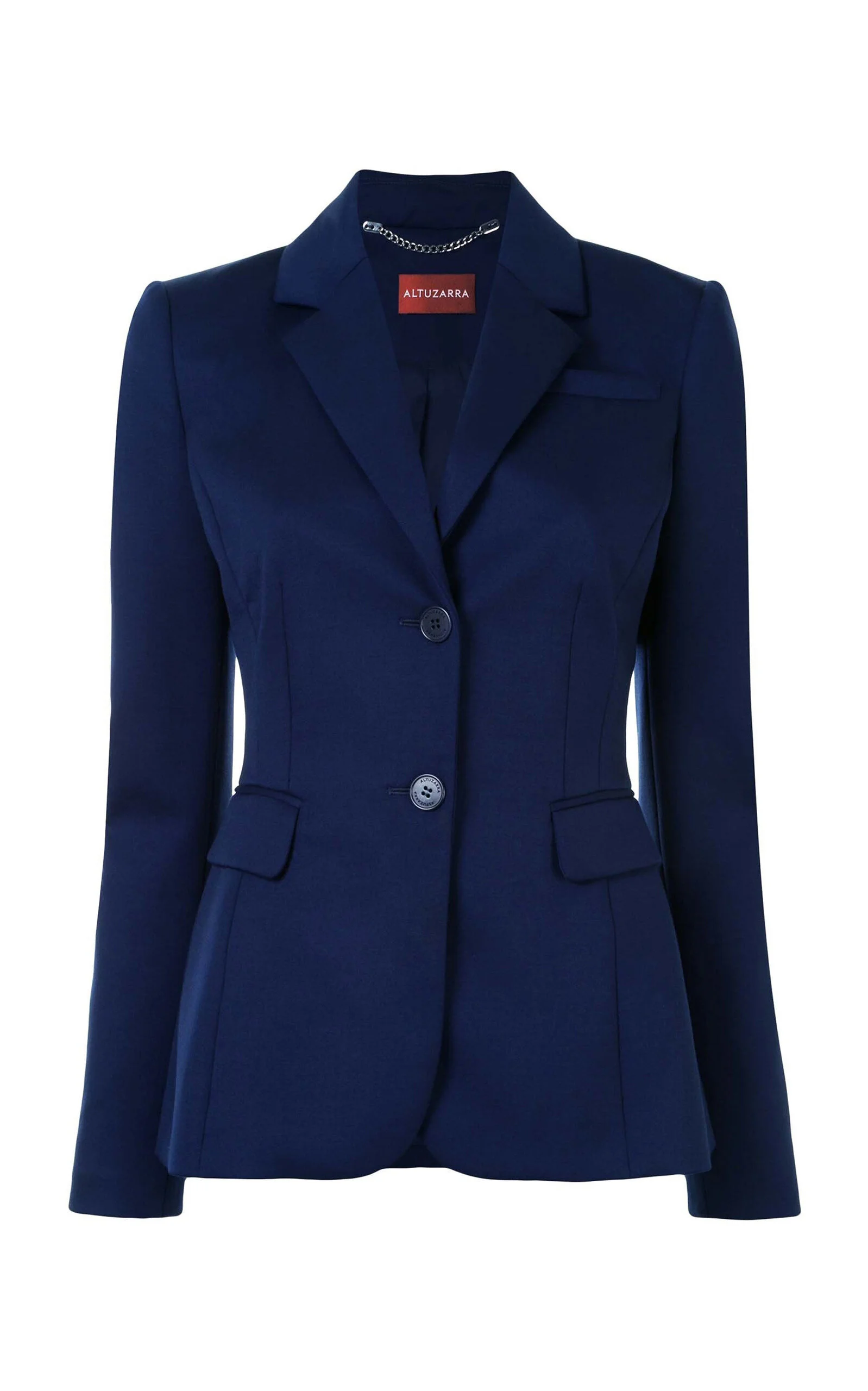 Anchored in artisanal craftsmanship, the Altuzarra brand speaks to the power, fearlessness and sensuality of the modern woman. The 'Fenice' Jacket is a signature Altuzarra silhouette, cut from tropical eco-wool to a slim fit with structured shoulders and a neatly tailored waist. It has high notched lapels, a single jet chest pocket and flap front pockets. PRODUCT DETAILS - This item is not eligible for expedited shipping - Button fastening at front - Composition: 98% virgin wool, 2% elastane - Designer color: Berry Blue - Dry clean - Made in Italy SIZE & FIT - Our model is wearing a size FR 34 - Model is 5'7" with a 32" bust, 23" waist, and 35" hip - Designed for a slim fit