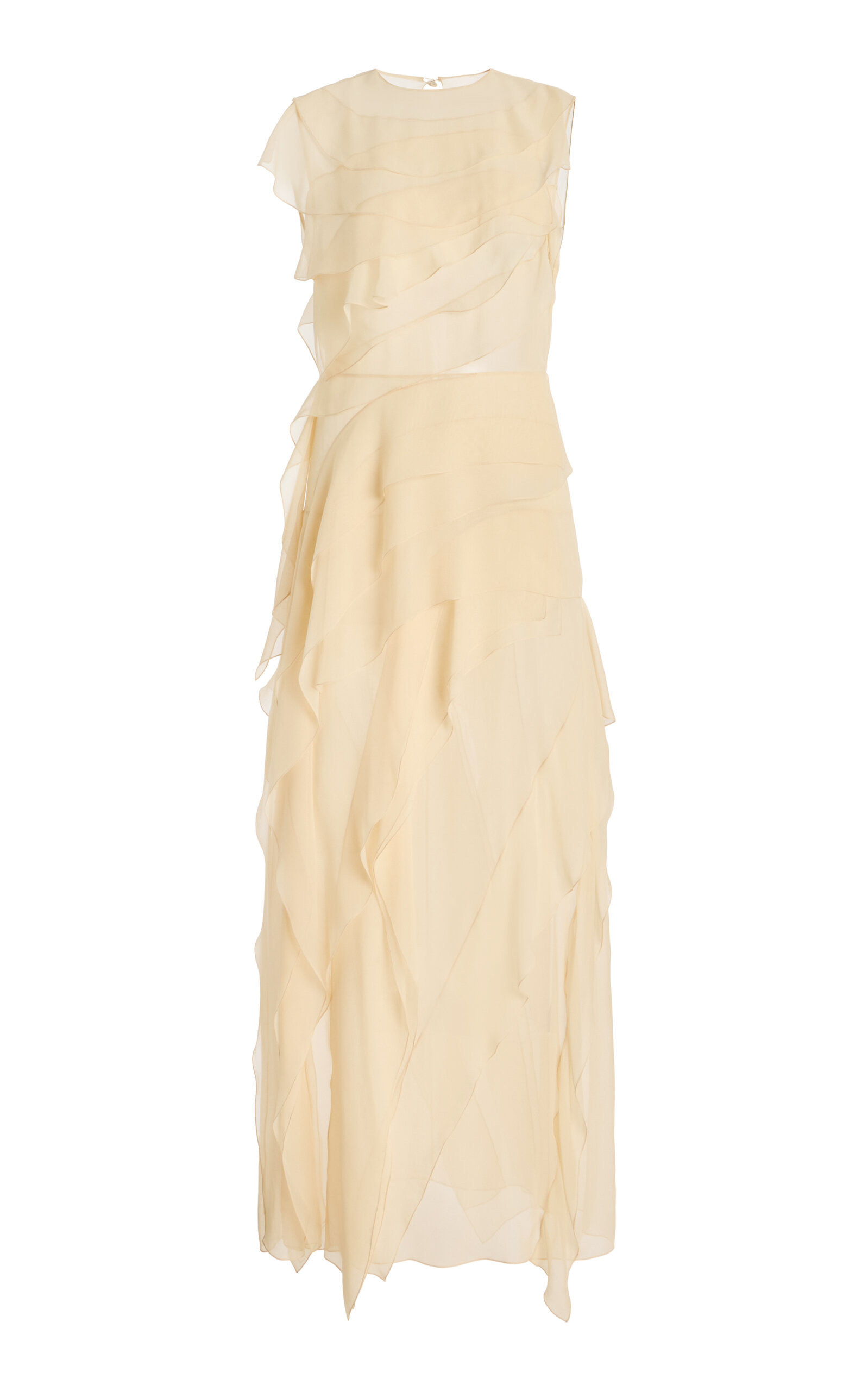 PRODUCT DETAILS - Sleeveless, crew neck, ruffled tiers, maxi hem - Concealed zip fastening - Composition: 100% Silk - Color: off-white - Dry Clean Only - Fall/Winter '25