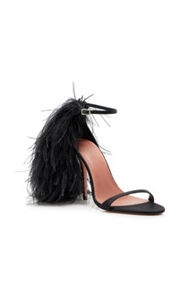 Well-crafted and unambiguously glamorous, Amina Muaddi's accessories are in high demand by international taste-makers. The brand is synonymous with vibrant hues, luxurious embellishments, and metallic shine all while being exquisitely designed to last well after the party. The 'Jerry' sandals have a strappy silhouette made from lustrous satin topped with frothy feathers at the heel — a true statement shoe. PRODUCT DETAILS - Heel measures approximately 105mm/ 4" - Buckle fastening - Composition: satin, feathers - Made in Italy