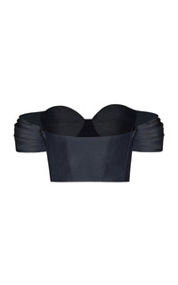 PRODUCT DETAILS - Off-the-shoulder, bustier bust, draped detail, fitted - Concealed zip fastening - Lined - Composition: 100% Tencel - Color: dark wash - Dry clean only - Pre-Fall '25