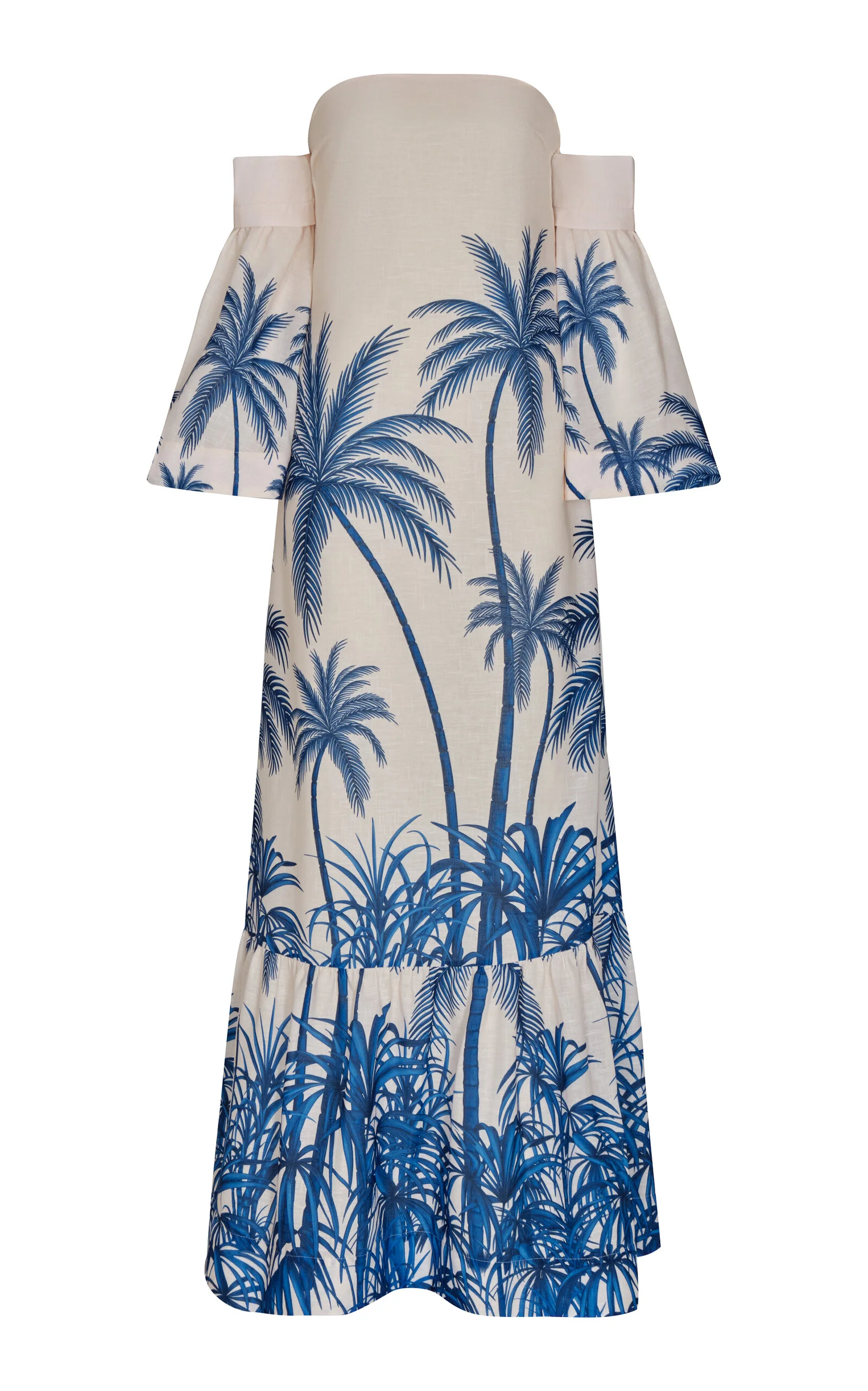 PRODUCT DETAILS - Slim fit, removable off-the-shoulder sleeves, square neck, palm tree print - Zipper fastening - Lined - Composition: 100% Linen - Color: blue - Dry Clean Only - Resort '26