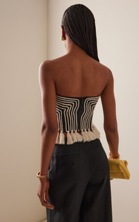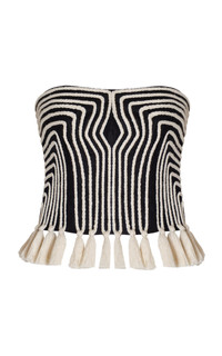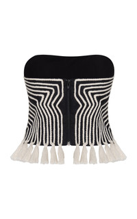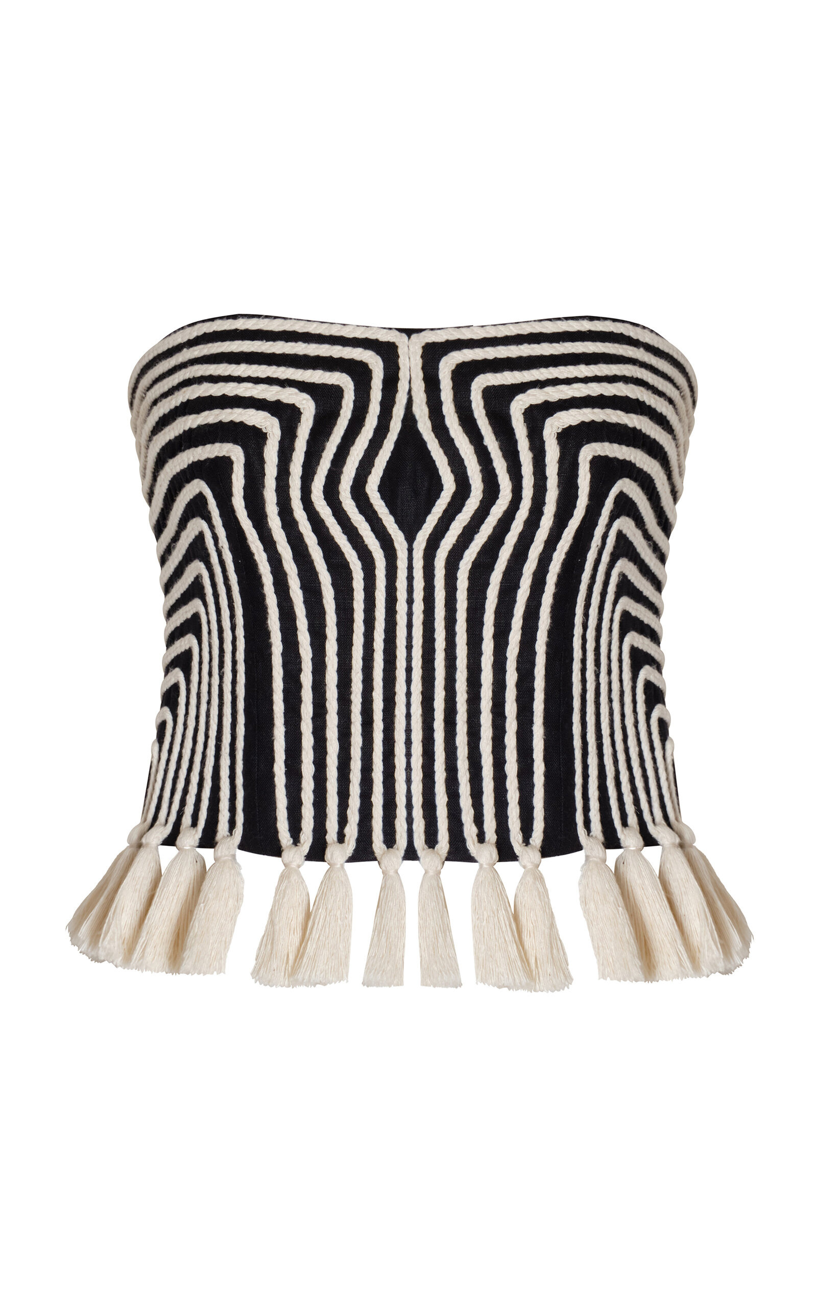 The Colombian designer draws inspiration from the lush, green landscapes of his home country’s tropical paradise. His goal? To mirror the vibrancy of the natural world through carefully designed pieces made from high-quality fabrics. The 'Escuchas' strapless top is crafted from embroidered linen and finished with playful tassels at the hem. Pair yours with the label's coordinating trousers. PRODUCT DETAILS - Fall-Winter '25 - Zip Closure Through Back - Composition: 100% Linen - Dry Clean Only - Color: black/white - Made in Colombia SIZE & FIT - Our model is wearing a size 2 - Model is 5’10” with a 31” bust, 23.5” waist, and 33.5” hip