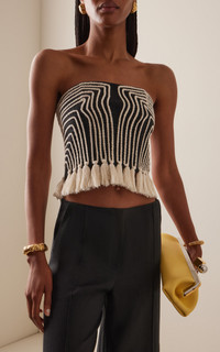 Escuchas cropped strapless tasseled embroidered linen top Black