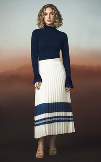 PRODUCT DETAILS - Regular fit, high rise, pleated detailing throughout, A-line silhouette midi with printed stipes by the hemline - Zip Closure Through Back - Lined - Composition: Chiffon 100% Polyester - Color: stripe - Dry Clean Only - Fall-Winter '25