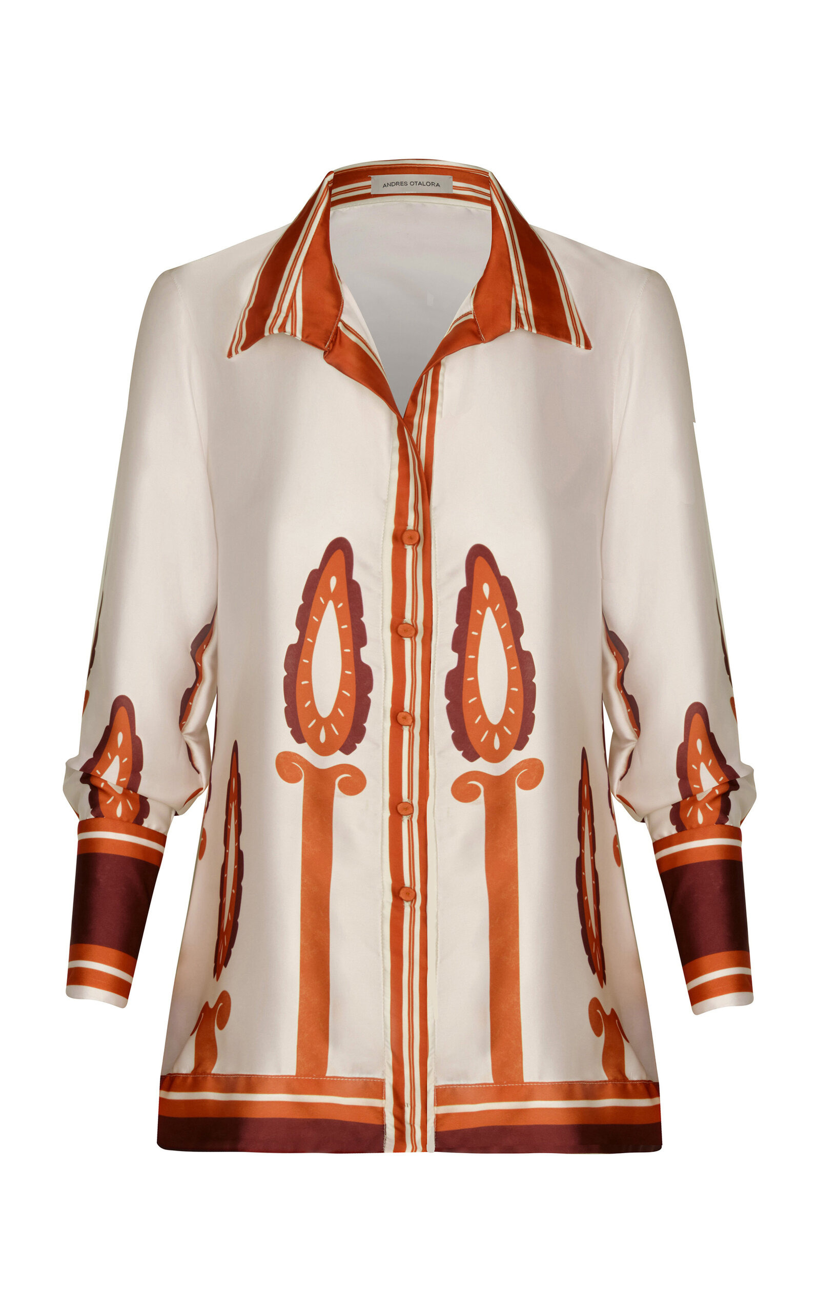 PRODUCT DETAILS - Regular fit, spread collar with cuff long sleeves, geometric printed torches throughout - Front Button Closure - Lined - Composition: 100% Linen - Color: print - Dry Clean Only - Fall-Winter '25