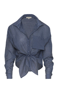 The Colombian designer draws inspiration from the lush, green landscapes of his home country’s tropical paradise. His goal? To mirror the vibrancy of the natural world through carefully designed pieces made from high-quality fabrics. The shirt is made of cotton that features stripe prints with a ribbon-tie detailing. PRODUCT DETAILS - Pre-Fall '25 - Button fastening through front - Composition: 100% Cotton - Color: navy - Dry clean only - Imported SIZE & FIT - Our model is wearing a size 2 - Model is 5’10” with a 30” bust, 24” waist, and 34” hip