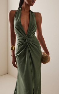 The Colombian designer draws inspiration from the lush, green landscapes of his home country’s tropical paradise. His goal? To mirror the vibrancy of the natural world through carefully designed pieces made from high-quality fabrics. The 'Mendra' maxi dress features gathered detailing by the waist with a sophisticated deep V-neckline and halter straps. PRODUCT DETAILS - Pre-Fall '25 - Slip on - Composition: Lycra 86% Polyester 14% Spandex - Color: green - Dry clean only - Imported SIZE & FIT - Our model is wearing a size US 2 - Model is 5'10" with a 30" bust, 24" waist, and 34" hip